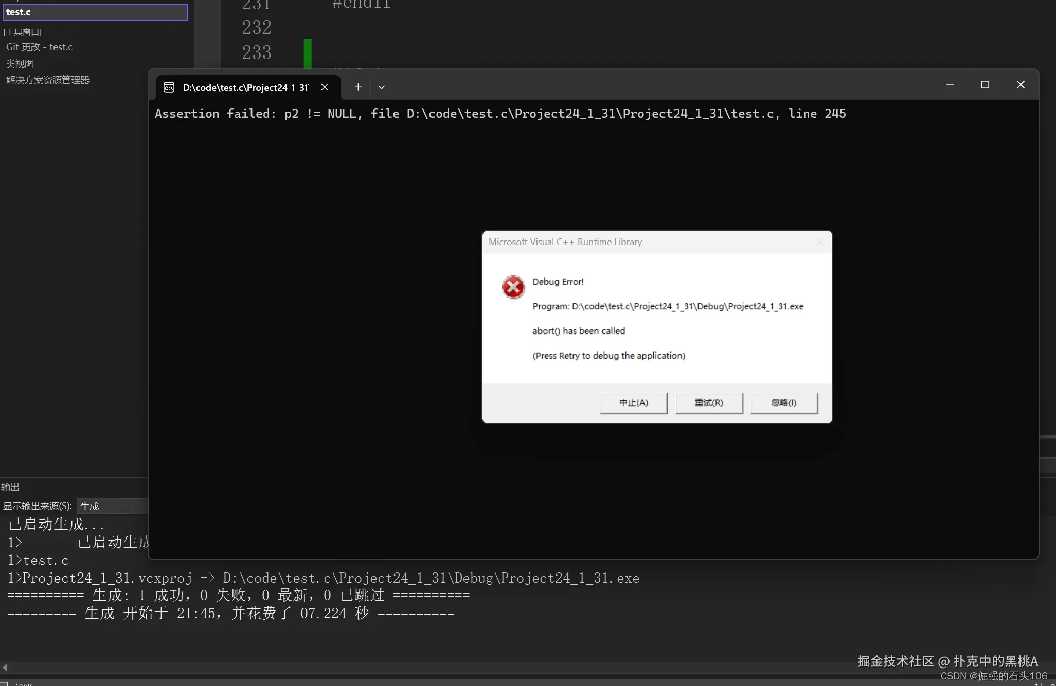 assert(p2 != NULL);//表达式为假,assert执行,程序崩溃