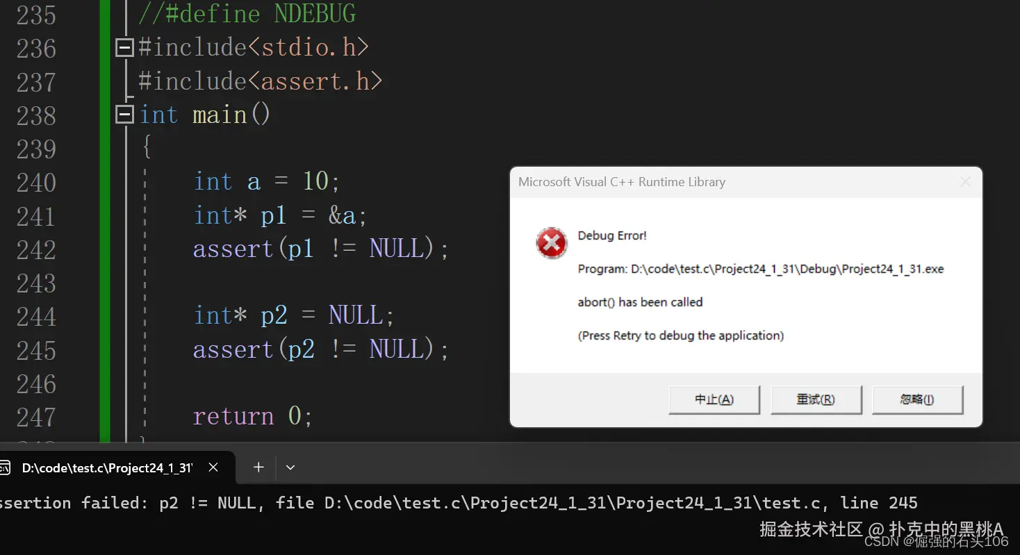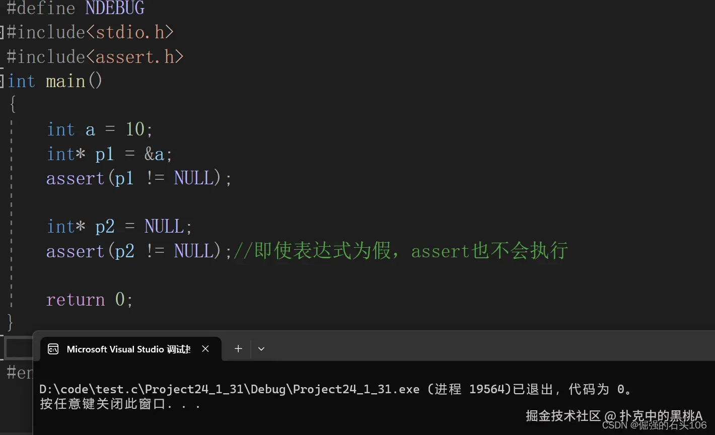 assert(p2 != NULL);//即使表达式为假,assert也不会执行