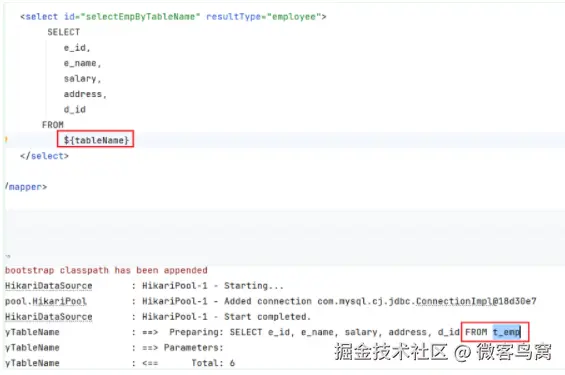 //按条件查询员工信息(动态条件) List<Employee> selectEmpByDynamicConditionWhere(Employee employee);<!-- 动态SQL--> <select id="selectEmpByDynamicConditionWhere" resultType="employee"> select e_id, e_name, salary, address from t_emp <where> <if test="eId != null"> e_id = #{eId} </if> <if test="eName != null"> and e_name like concat('%',#{eName},'%') </if> </where> </select>