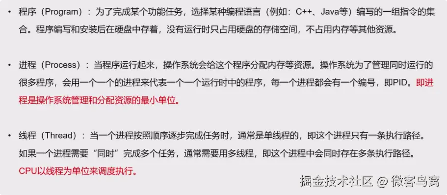 程序是未运行状态。进程是程序的运行时的状态。线程是进程中的其中1条执行路径。