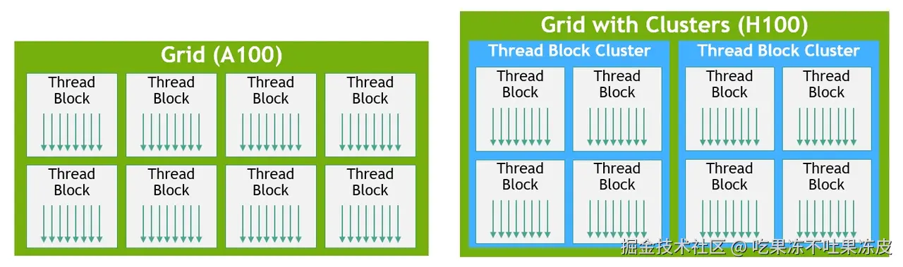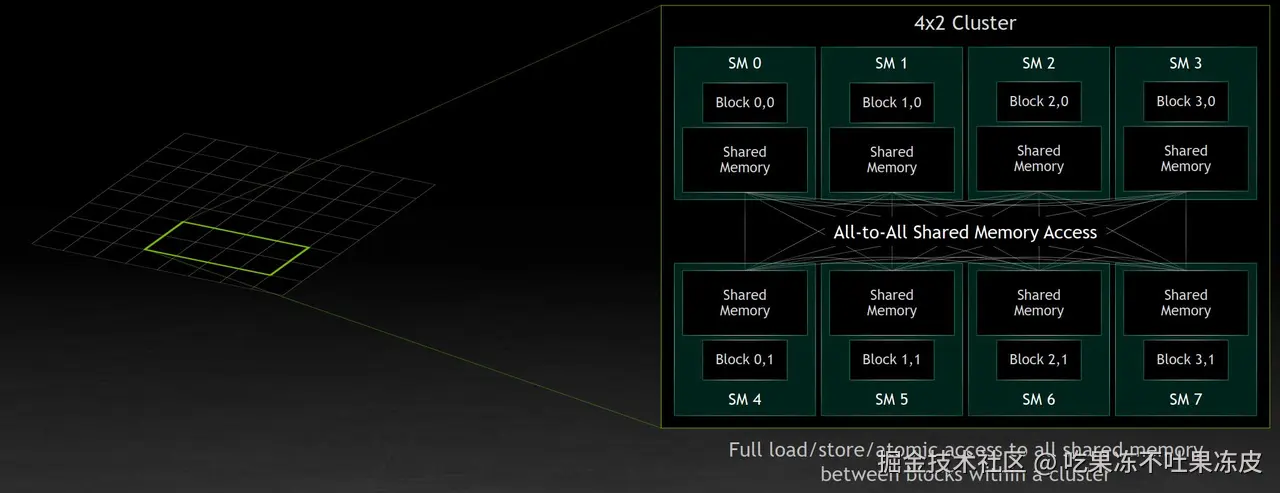 Thread Block Cluster映射到硬件上的表示如下: