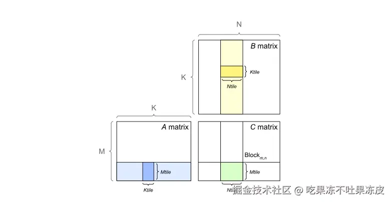 GPU 通过将输出矩阵划分为图块来实现 GEMM,然后将其分配给线程块。图块大小(Tile Size)通常是指这些图块的尺寸。每个线程块通过单步执行图块中的 K 维度,从 A 和 B 矩阵加载所需的值,然后将它们相乘并累加到输出中来计算其输出图块。