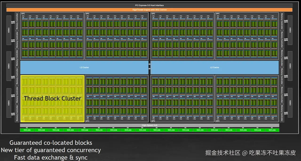 从硬件角度来看,同一个Thread Block Cluster中的Block被调度在同一个GPC(GPU processing cluster)上。GPC由一系列物理位置上相邻的SMs组成,运行在同一个GPC上的Blocks之间可以享有更快的local synchronization和更快的memory sharing。