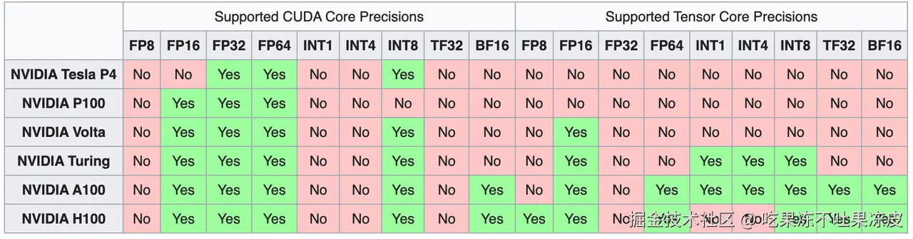 此外,Tensor Core 和 CUDA Core 支持的数据类型也不同。下图展示了不同GPU架构 Tensor Core 和 CUDA Core 支持的数据类型。