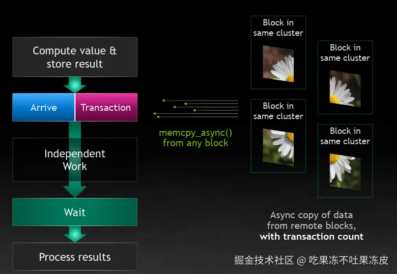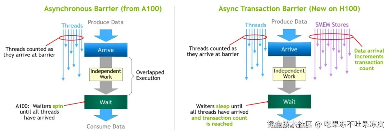 让线程不要白白等待,去做一些别的工作,这种想法其实是很自然的。Hopper架构保留了这一特性,并且增添了一个新的Feature,即 Asynchronous transaction barrier(如上图右)。