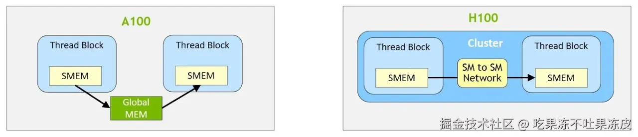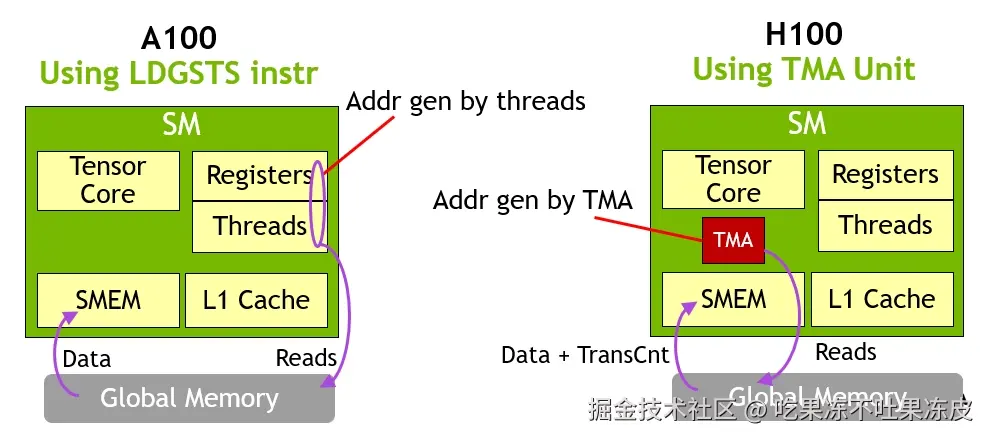 看到这你可能会想,这种机制也挺好想出来的,为什么Amper架构不支持呢?其实,Hopper架构新增的TENSOR MEMORY ACCELERATOR UNIT (TMA) 硬件才使这种机制变成“更高效的机制”。而且,白皮书里说TMA的提出是为了更好的feed数据给更快速的第四代Tensor core,因此,猜想可能Ampere架构下的内存拷贝机制已经满足Ampere架构的算力需求了。