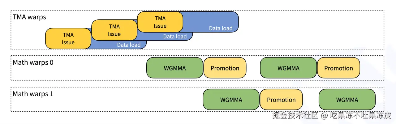 - DeepGEMM遵循 CUTLASS 设计, 其内核为warp-specialization,支持数据移动、Tensor Core MMA 指令和 CUDA Core 提升精度的重叠。Warp-specialization 是一种 GPU 编程模型,它允许在一个线程块(thread block)内的不同 warp(一组 32 个线程)被赋予不同的角色或任务。warp-specialization在NVIDIA Hopper架构的GPU上特别有效,因为它可以更好地利用TMA(Tensor Memory Accelerator)和WGMMA(warp-group-level matrix multiply-accumulate)指令。
