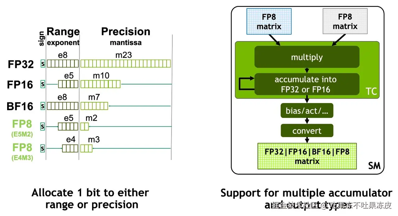FP8 Tensor Cores 支持 FP32 和 FP16 累加器,以及两种新的 FP8 输入类型: