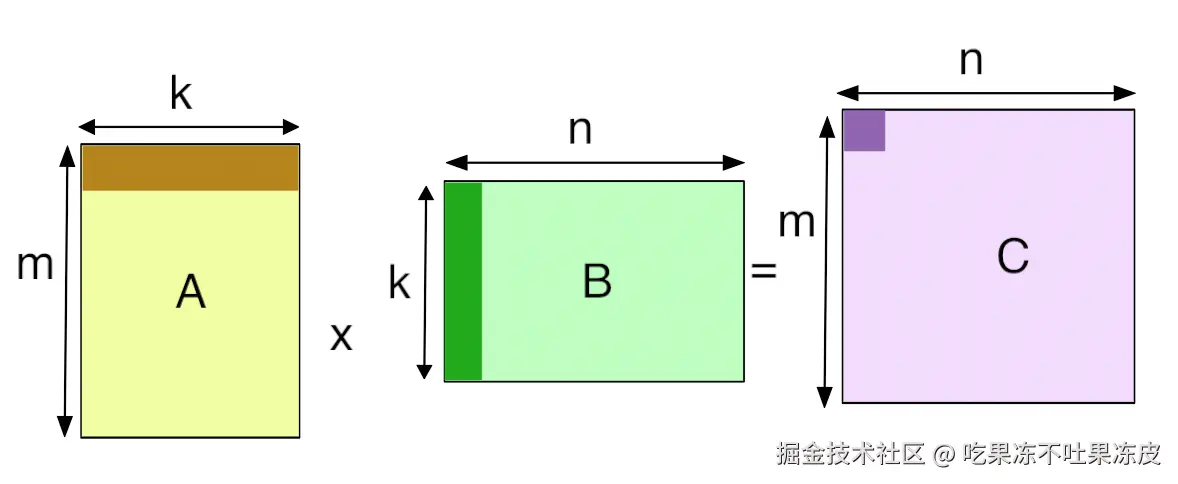 在GPU中,GEMM 定义为运算 C=αAB+βC,其中 A、B、C 是矩阵,α 和 β 是标量。对于普通矩阵乘,α 等于 1 且 β 等于 0 。例如,在全连接层的前向传播中,权重矩阵为参数 A,传入激活为参数 B,α 和 β 通常分别为 1 和 0。在某些情况下,β 可以是 1。