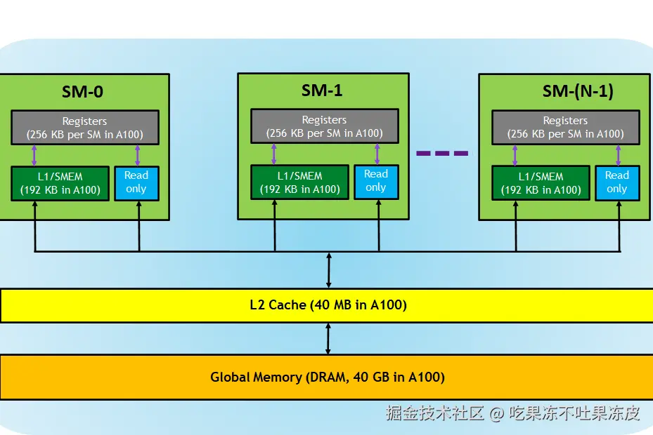 GPU 内存可以分为局部内存(local memory)、全局内存(global memory)、常量内存(constant memory)、共享内存(shared memory)、寄存器(register)、L1/L2 缓存等。其中,全局内存、局部内存、常量内存都是片下内存,储存在 HBM 上。而所有的 SM 共享 L2 缓存。