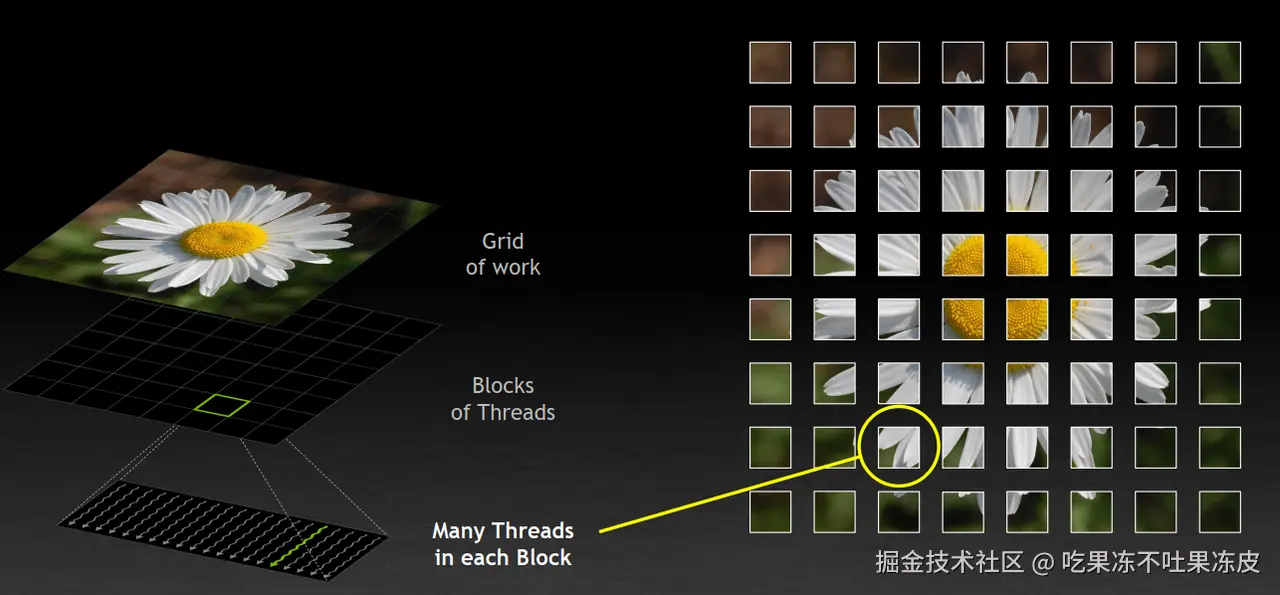 为什么要划分Block?一是要实现大规模的并行处理,还有就是要利用“局部性”。一个Block中的所有线程会被调度到同一个SM中,这样,Block中的线程数据交换和通信就会高效得多。如下图,在图像处理kernel中,一整个图片被切分成相同大小的数据,分配到不同的SM中处理。