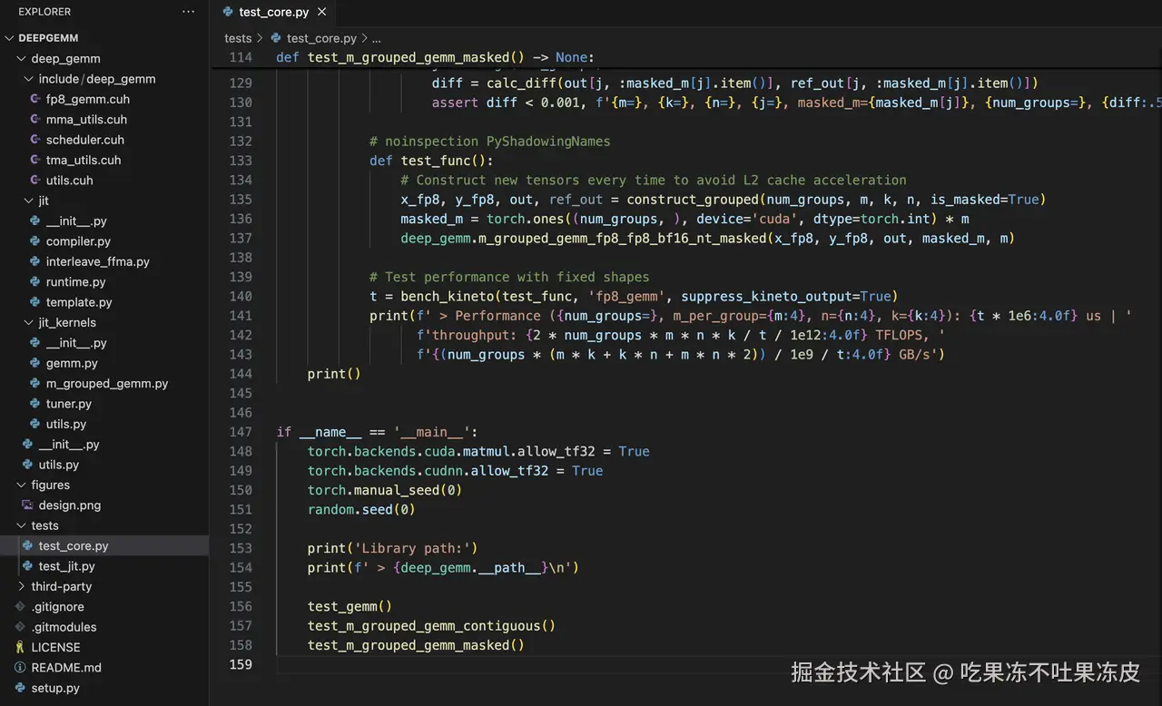 - m_grouped_gemm.py:用于定义两个分组通用矩阵乘法(GEMM)函数,支持FP8输入和BF16输出,并且使用了即时编译(JIT)和自动调优功能。