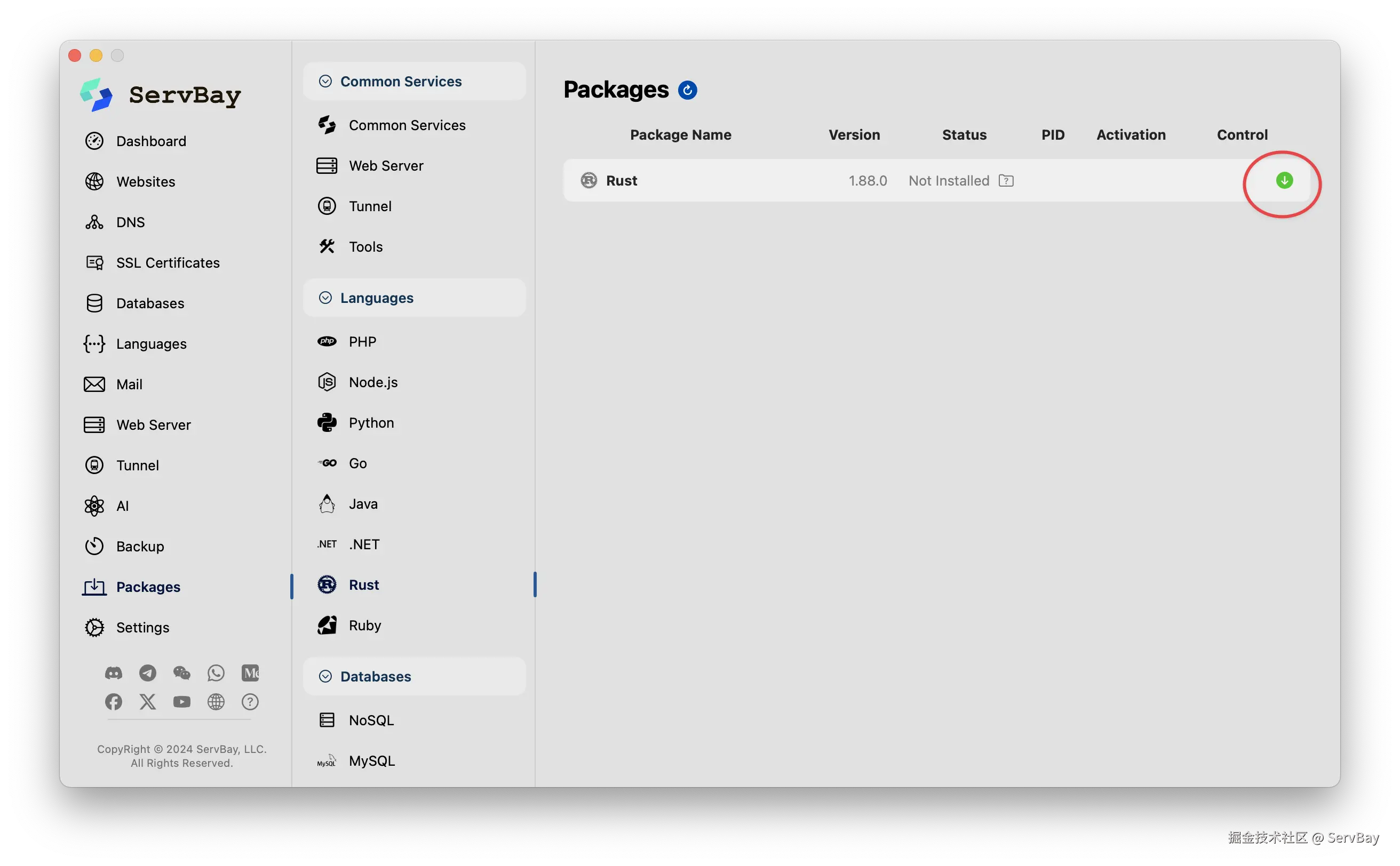 下载完后,来到在左边的服务列表里找到「软件包」,找到Rust,点击绿色按钮下载即可。