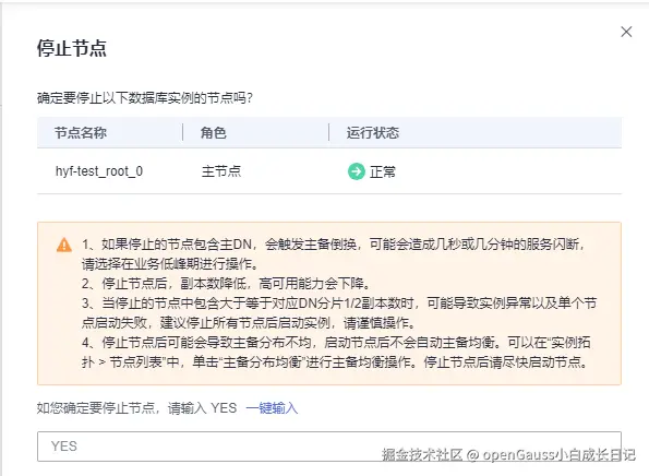 - 如果停止的节点包含主DN,会触发主备倒换,可能会造成几秒或几分钟的服务闪断,请选择在业务低峰期进行操作。