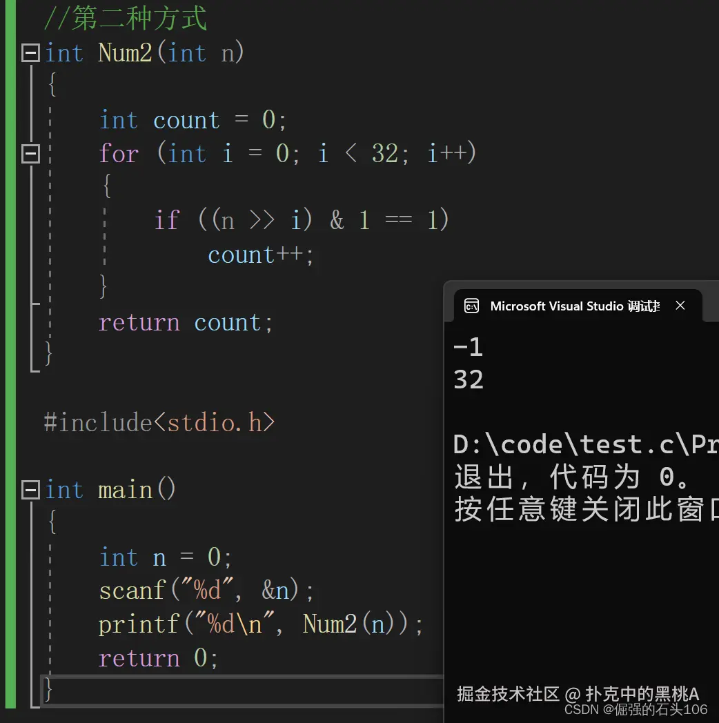 将上述过程放在for循环中,第一次右移0位,第二次右移1位,直到右移31位。统计1的个数,返回