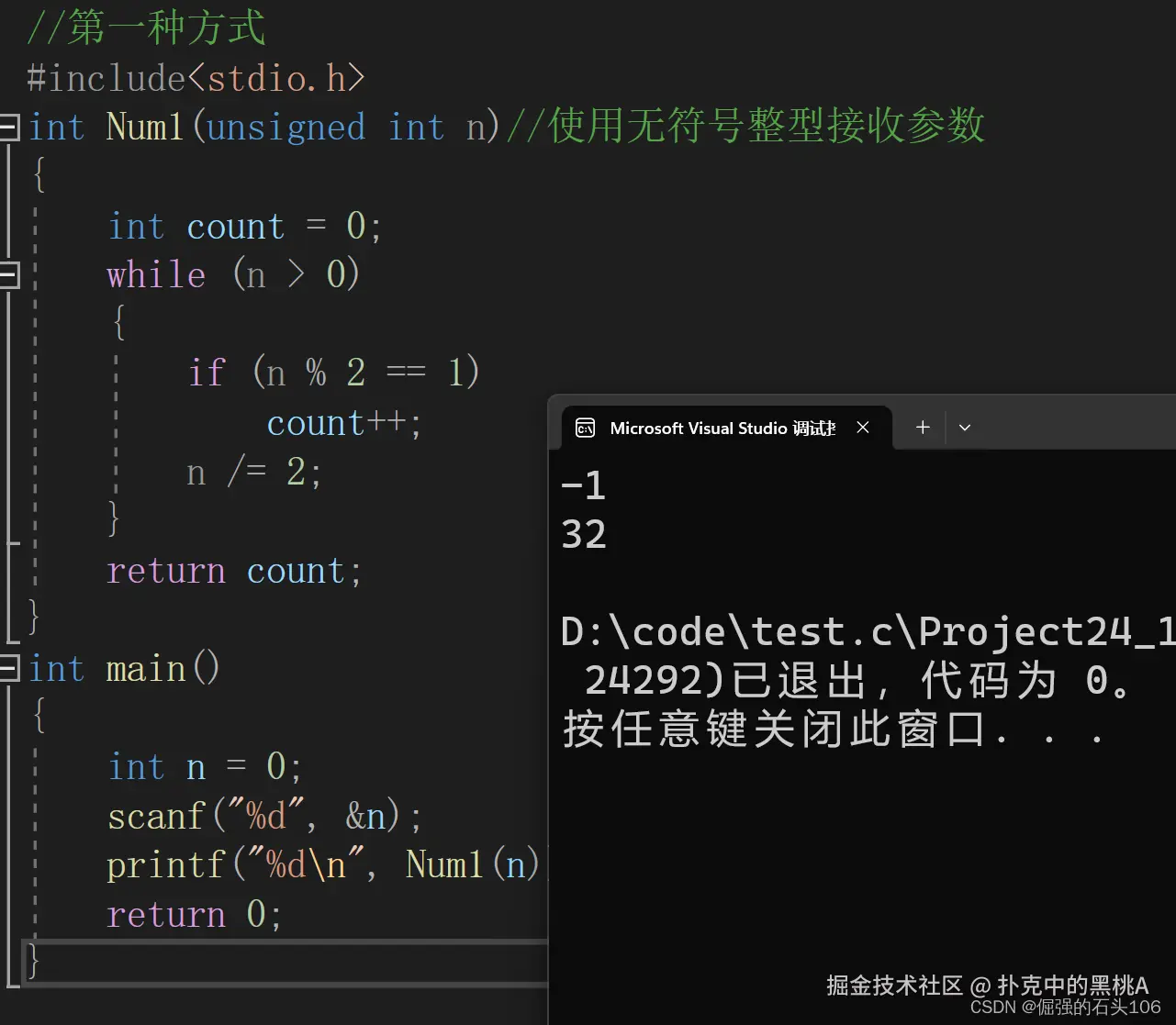 解决方法就是在函数参数使用无符号整型接收数据,这样接收到的负数就会将它看作是一个较大的整数。在这种情况下,可以看到输入-1,得到的正确结果是32