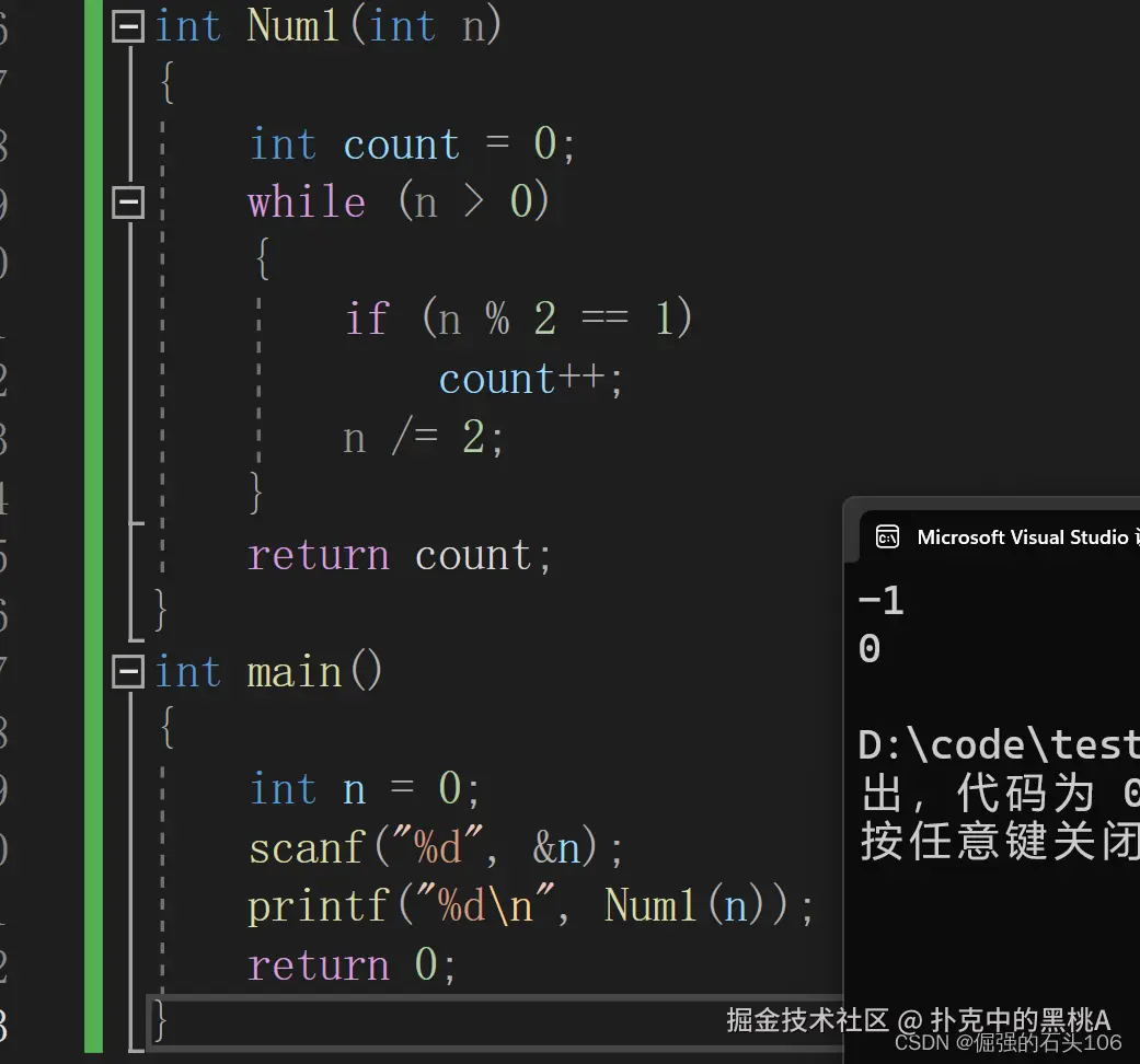 当要判断的整数是负数时,循环不会进去。比如输入-1,就会得到0,这显示是不正确的
