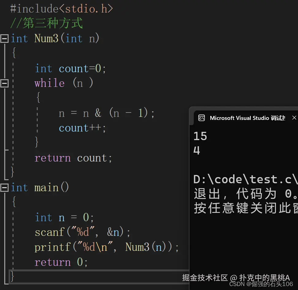 n = n & (n - 1);//每次去掉一个二进制的1