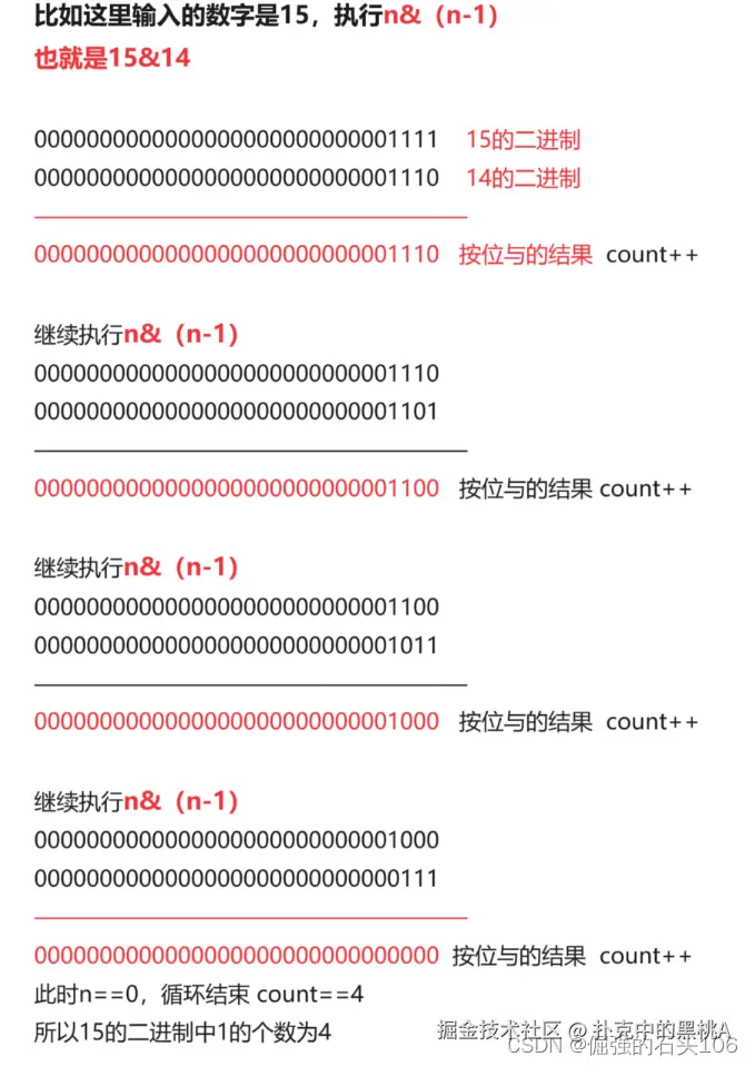 将输入的数字 n 与n-1进行按位与操作,每次会去掉一位二进制位的1