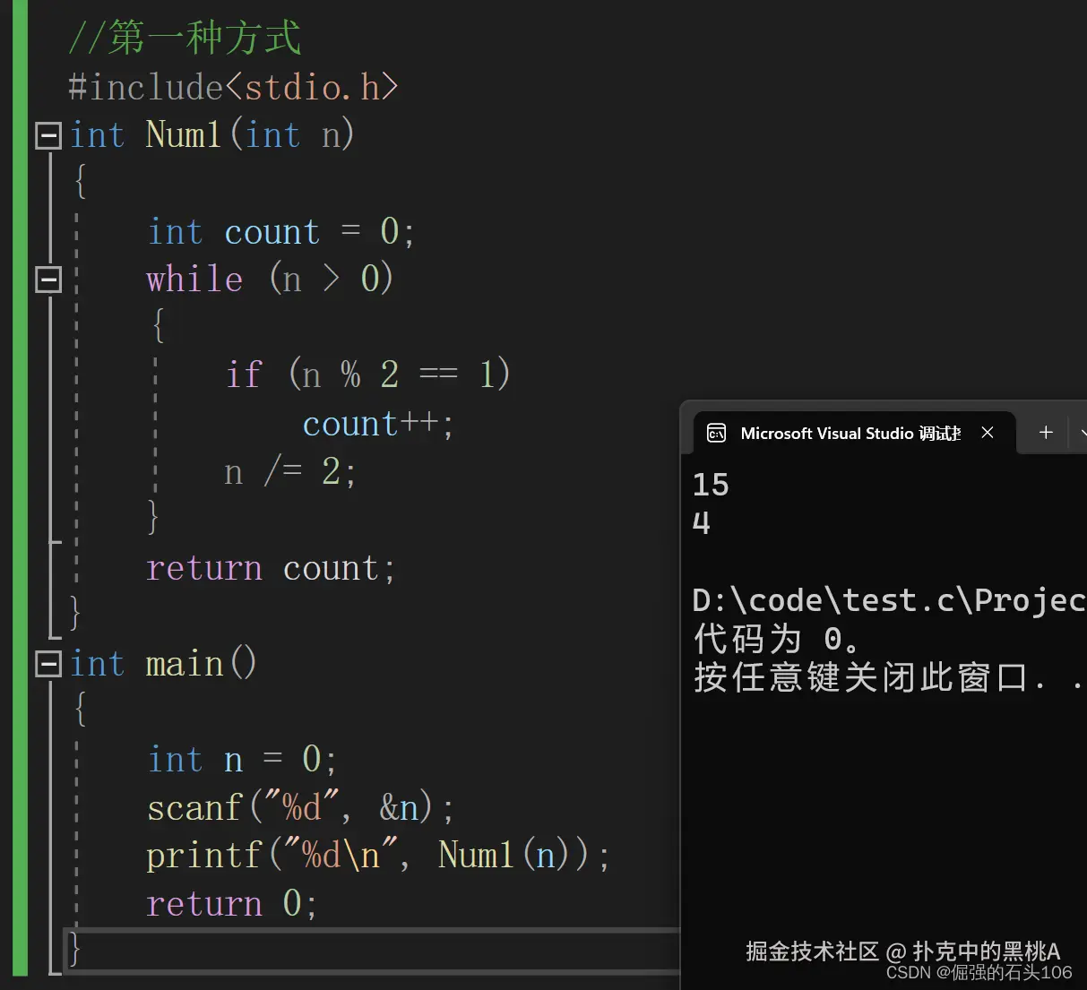//第一种方式 #include<stdio.h> int Num1(int n) { int count = 0; while (n > 0) { if (n % 2 == 1) count++; n /= 2; } return count; } int main() { int n = 0; scanf("%d", &n); printf("%d\n", Num1(n)); return 0; }