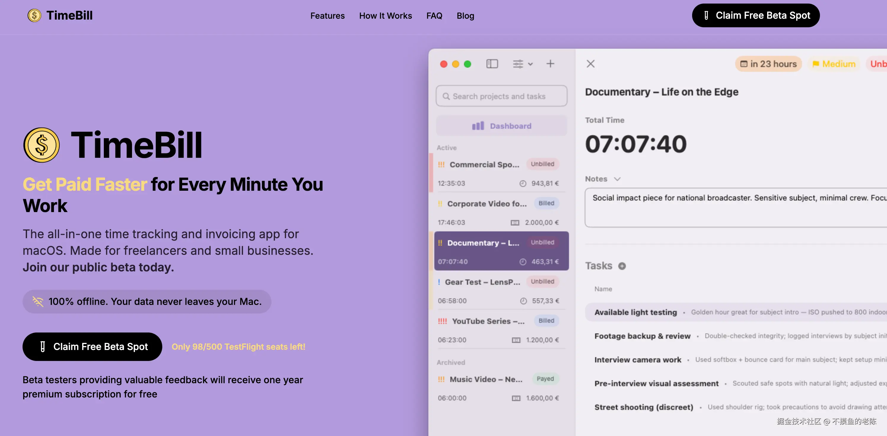 TimeBill是一款macOS时间追踪器,专为自由职业者和顾问设计,离线使用,提供一键式时间跟踪、项目管理和PDF发票等功能。