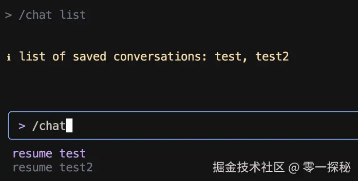 这个命令主要是用于管理对话聊天记录,比如我们在退出命令行终端时,可以使用 /save + tag 把当前对话加上标签。当下一次启动cli工具时,就可以用 /chat resume tag 来恢复对话,也可以使用用 /chat list 来列出记录的对话