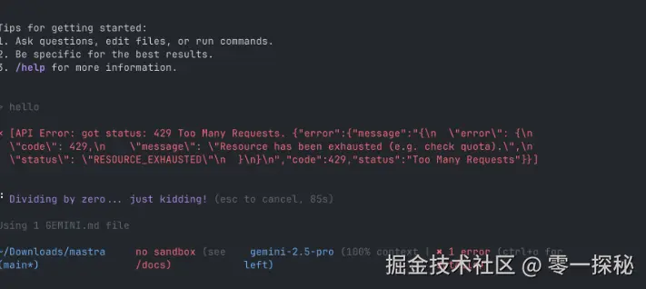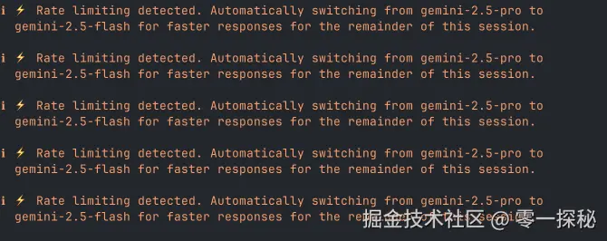 当用户请求过多时,gemini-cli 会一直显示如图中的错误提示,这个提示会每隔一分钟左右在控制台重复出现,程序陷入死循环,无法正常响应。