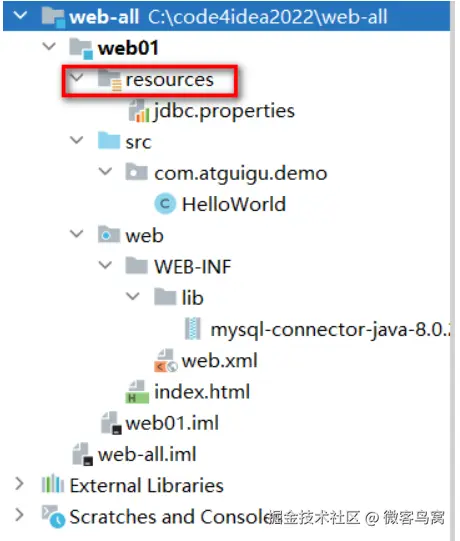 - 在工程下创建resources目录,专门用于存放配置文件(都放在src下也行,单独存放可以尽量避免文件集中存放造成的混乱);