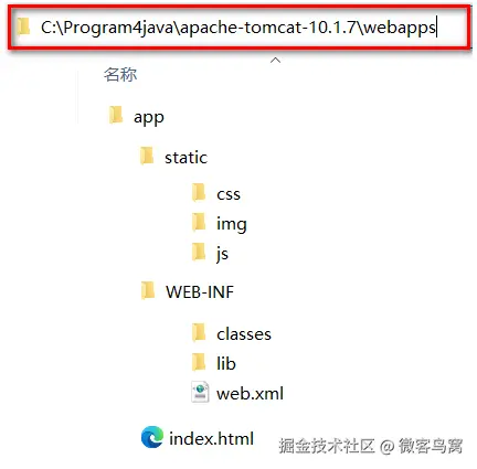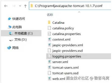 C:\Program4java\apache-tomcat-10.1.7 这个目录下直接包含Tomcat的bin目录,conf目录等,我们称之为Tomcat的安装目录或根目录。