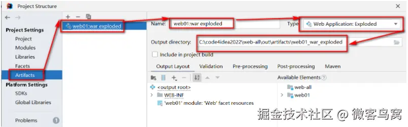 - 检查idea是否识别modules为web项目,并且存在将项目构建成发布结构的配置: