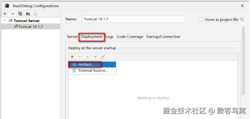 - 选择Deployment,通过+添加要部署到Tomcat中的artifact:
