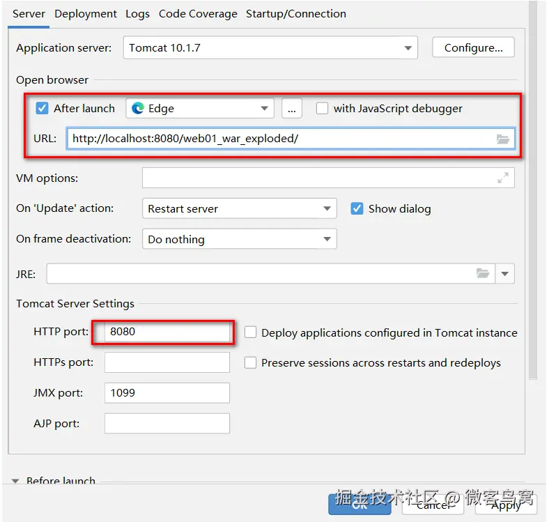 - 点击apply 应用后,回到Server部分。After Launch是配置启动成功后,是否默认自动打开浏览器并输入URL中的地址,HTTP port是HTTP连接器目前占用的端口号:
