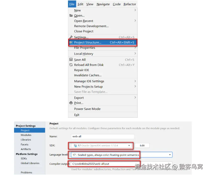 - 检查项目的SDK,语法版本,以及项目编译后的输出目录: