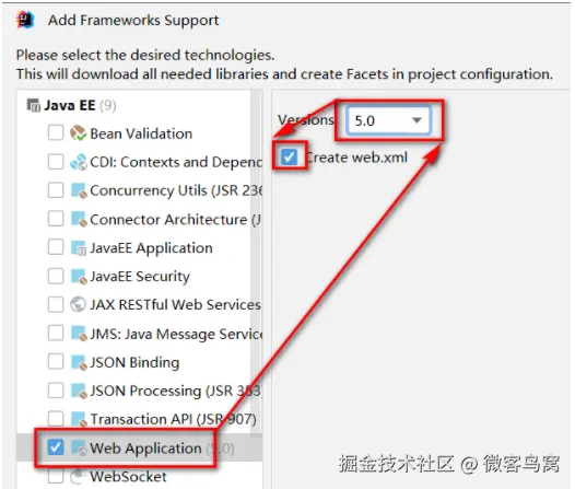 - 选择Web Application 注意Version,勾选 Create web.xml:
