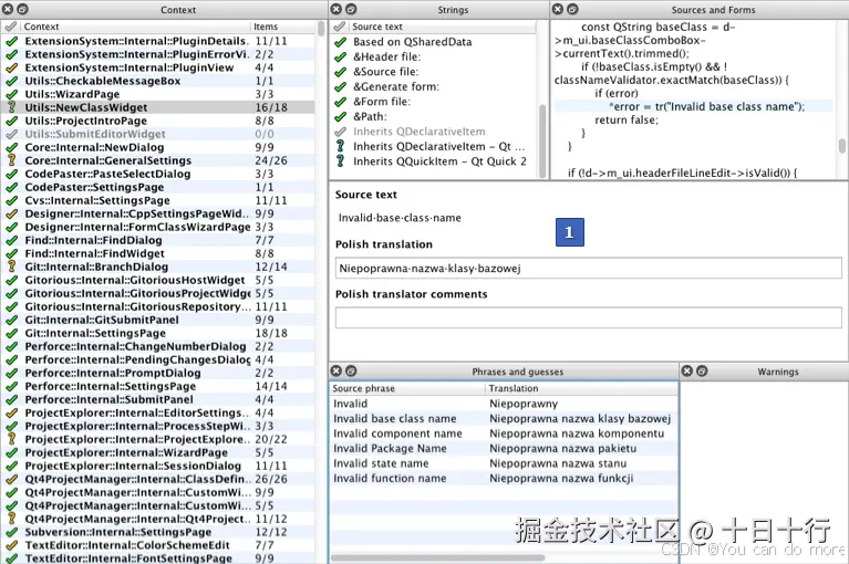 如果源代码上下文显示了错误的源代码行,可能意味着翻译文件与源文件不同步。有关如何使翻译文件与源文件重新同步的更多信息,请参阅使用 lupdate。
