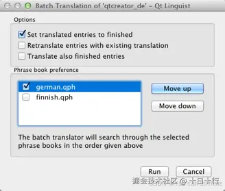 使用 Qt Linguist 的批量翻译功能,可自动翻译短语集中的源文本。要配置在批量翻译过程中以何种顺序使用哪些短语集,请选择 “编辑”>“批量翻译”。您可以指定是否只考虑当前没有翻译的条目,以及是否将批量翻译的条目标记为已接受。