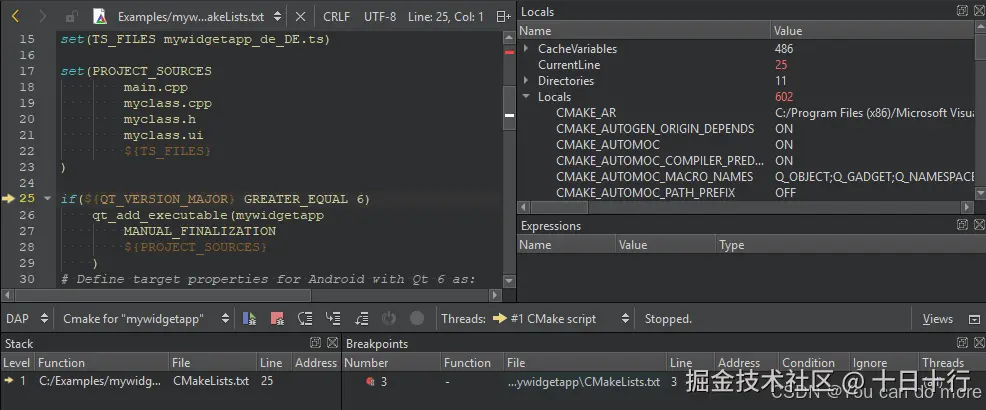 通过 Qt Creator 的调试适配器协议(DAP)实现,您可以调试 CMake 项目文件。