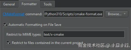 - 在限制 MIME 类型中,添加要格式化的文件的 MIME 类型,用分号分隔。 默认值为 text/x-cmake 格式的 CMake 文件。 如果该字段为空,则所有文件都会被格式化。