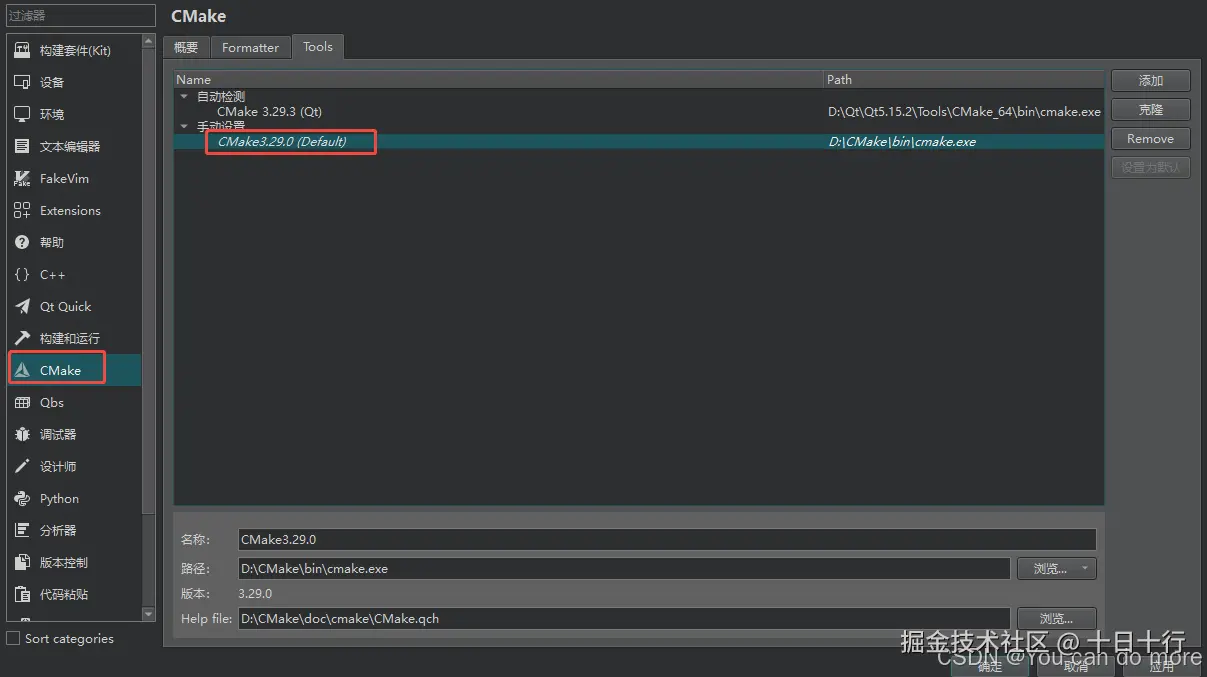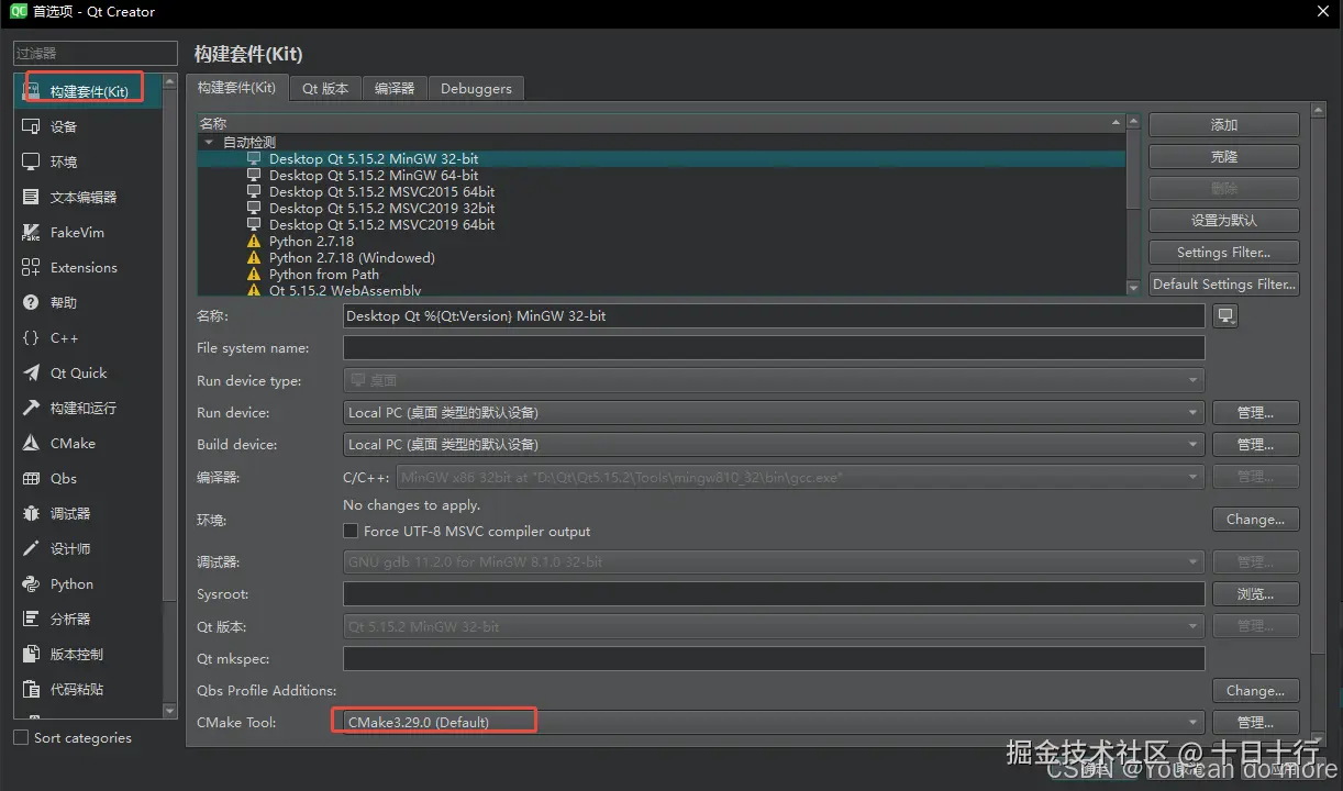 可以将其设置为默认,如此新建的kit会自动选择默认cmake