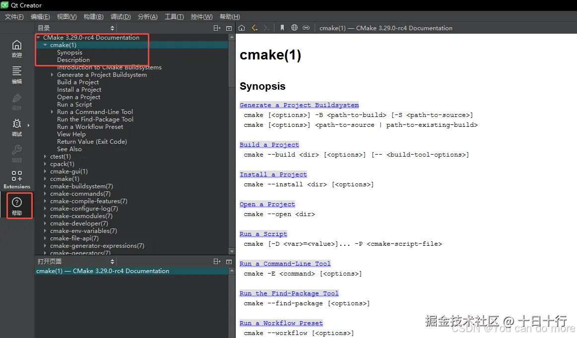 安装 CMake 时,CMake 文档会以 Qt 帮助文件格式 (.qch) 安装。 它由 Qt Creator 自动注册,您可以通过以下方式查看:
