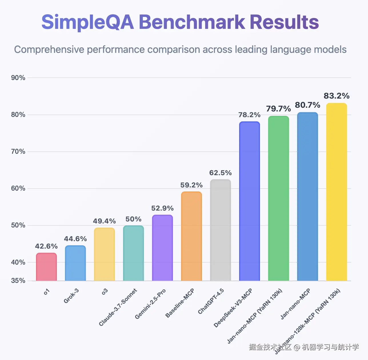 Jan-Nano-128k 已通过基于 MCP 的方法在 SimpleQA 基准测试中完成严格评估,其表现显著优于前代模型: