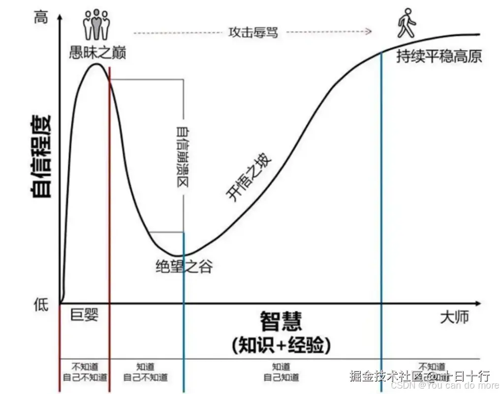 第一阶段是从开始到愚昧山巅,是在巨婴的位置,是不知道自己不知道,是我们自我感觉良好的状态。据说此类状态的人占95%;