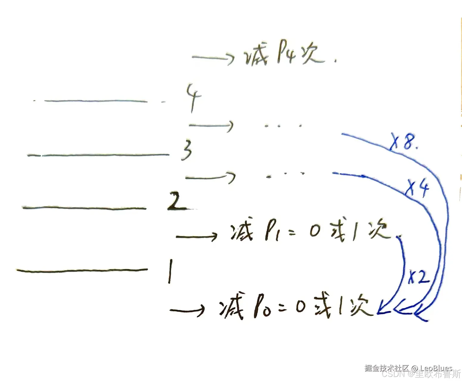 这里有一个关键点:对于每个p_i (0<= i <=x-1) ,x是除法操作的次数,如果p_i>=2,可以将2个p_i的减法操作去掉,在p_(i+1)中增加一个减法操作,这样可以用更少的减法操作次数达到同样的效果,所以最终,每个p_i (0<= i <=x-1),p_i要么是0,要么是1,p_x中保存了自底向上累计的减法,所以p_x取值任意