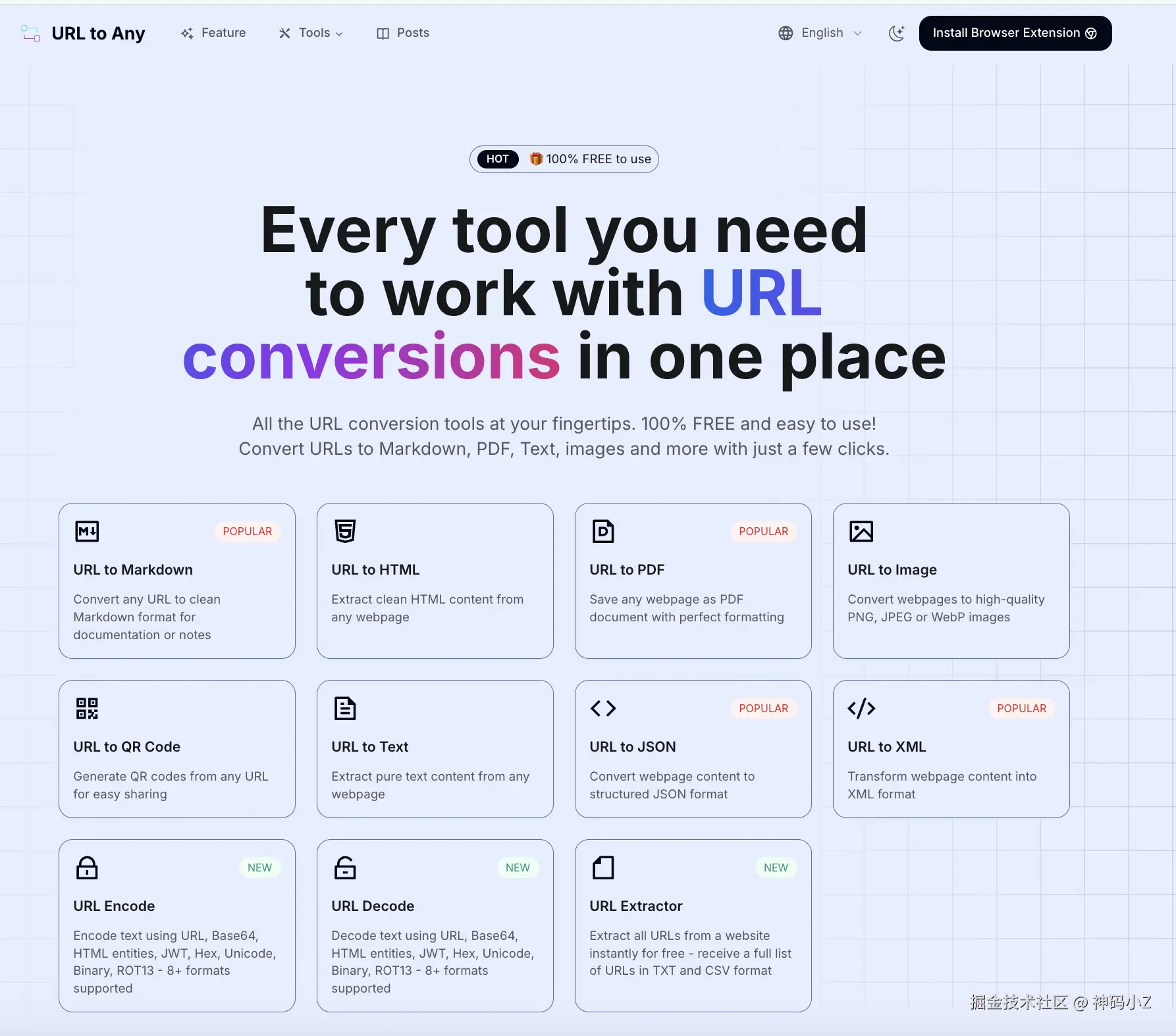 URL to Any是一个强大的在线工具集,可以将任何网页URL转换为PDF、图片、文本等10多种格式,完全免费且无需注册。