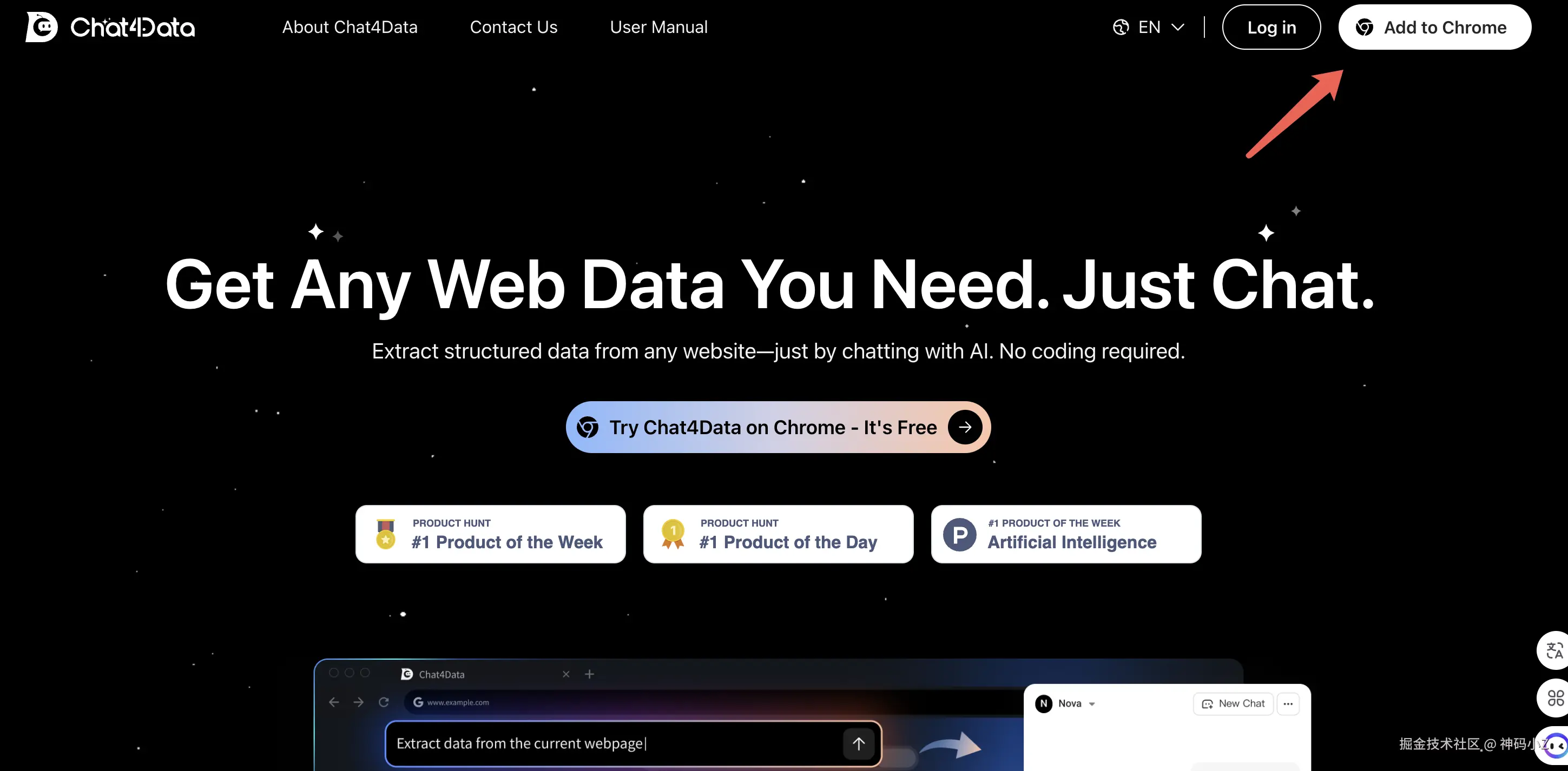 Chat4Data是一款Chrome浏览器扩展,通过自然语言对话的方式从任何网站提取结构化数据,让数据采集变得像聊天一样简单。