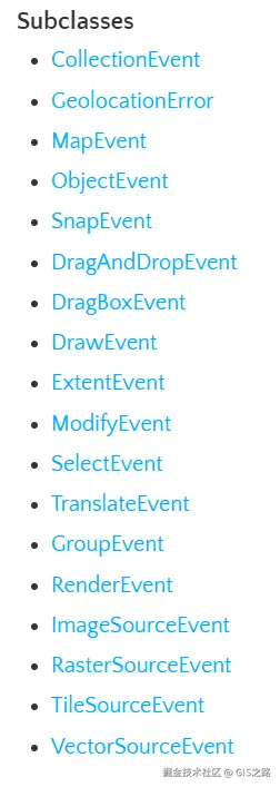 event.pixel属于OpenLayers封装的事件对象,用于直接获取OpenLayers事件对象中的像素坐标。以下截图是一些OpenLayers封装事件类型,包括地图事件、选择事件、绘制事件等多种类型。有关更多OpenLayers事件信息,可参考文章: