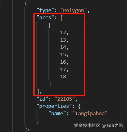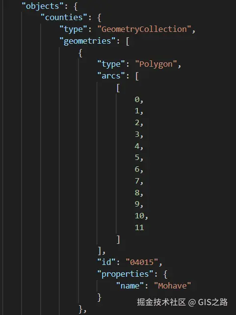 TopoJSON 数据与 GeoJSON 数据相似,都以 JSON 对象为基础,采用键值对方式进行表达,以下是一个简单的TopoJSON 数据结构示例:
