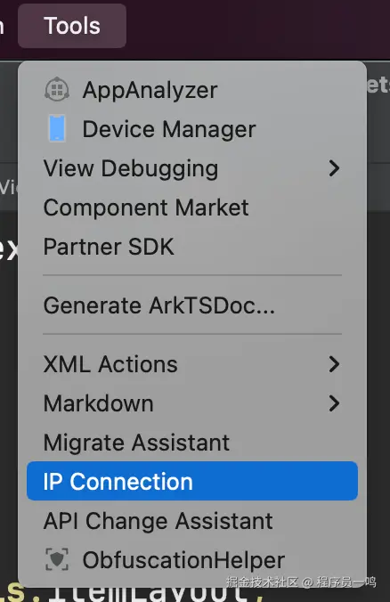 目前连接设备有两种方式,一种是通过DevEco Studio进行配置,在在DevEco Studio菜单栏中,找到Tools菜单,找到IP Connection选项。