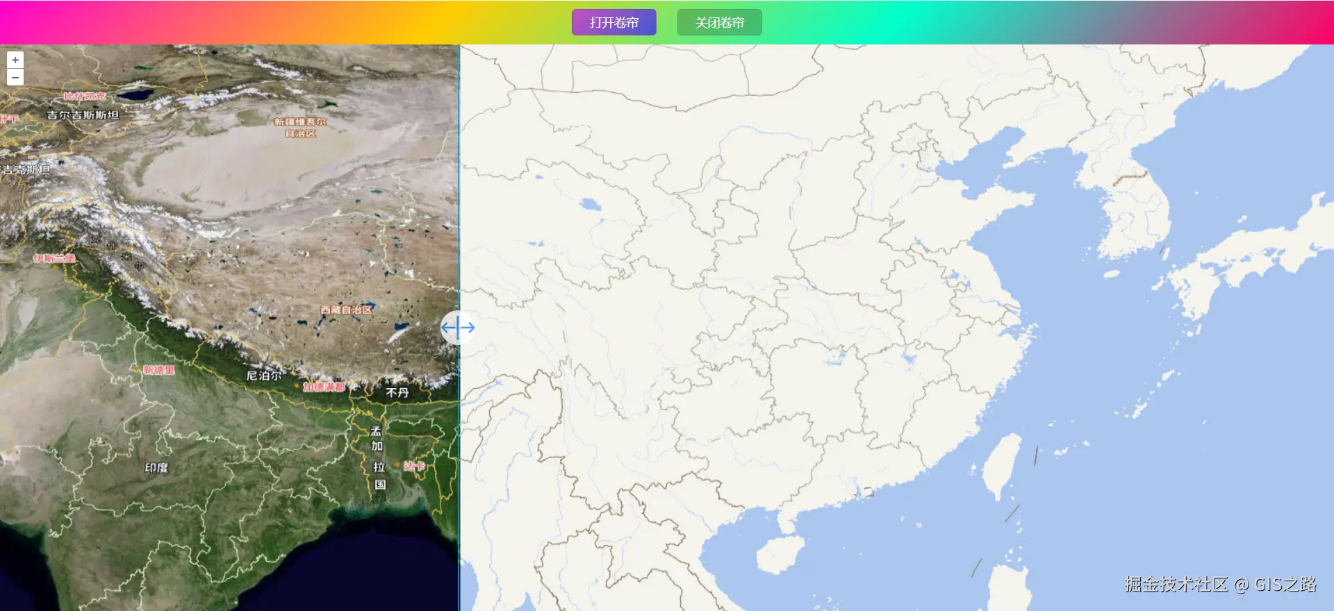 地图卷帘主要用于比较两个或多个叠加在一起的地图图层或影像之间的差异,是一种地图可视化技术。允许用户通过鼠标或其他交互方式,模拟将上层影像或图层像窗帘一样卷起或滑动,从而逐渐露出下层的影像或图层,使用户能够直观地比较图层的区别。