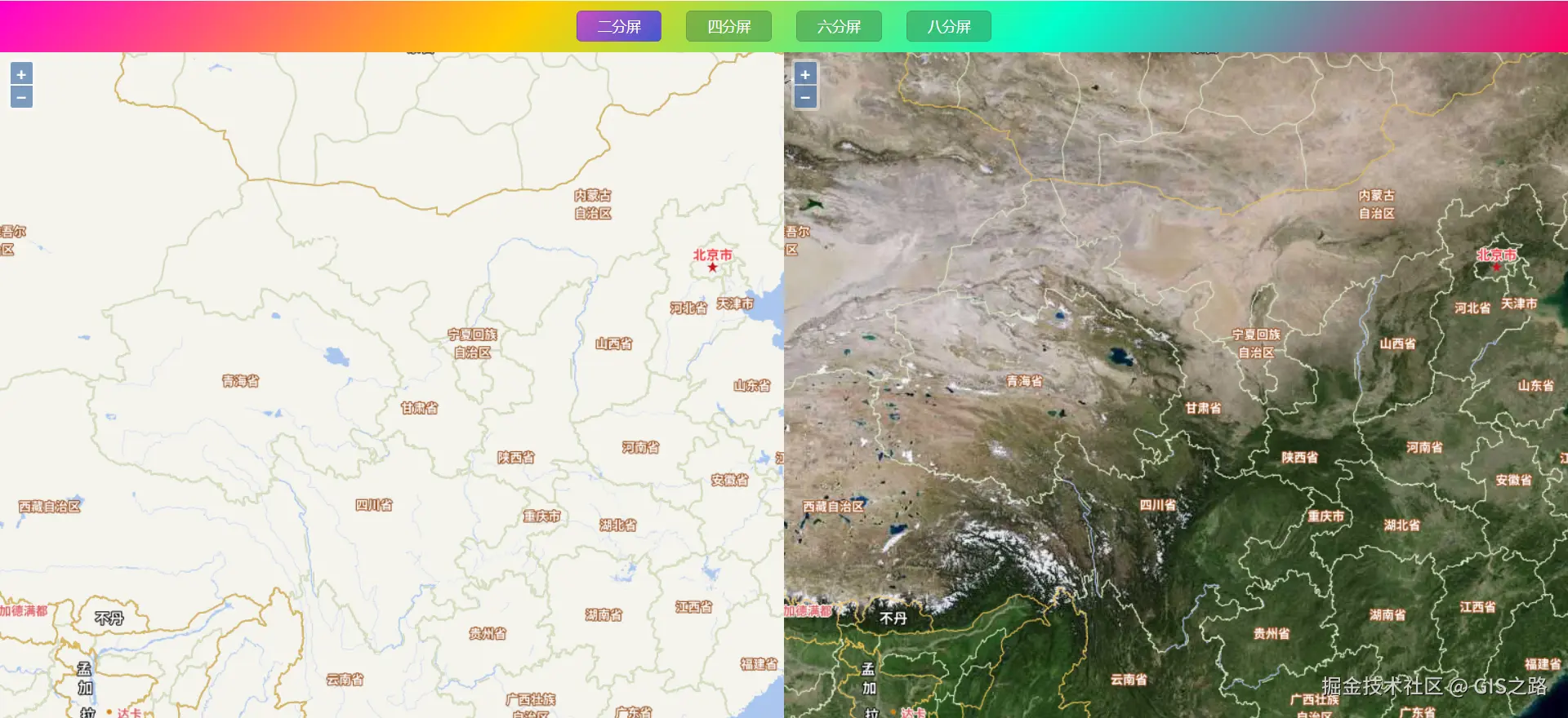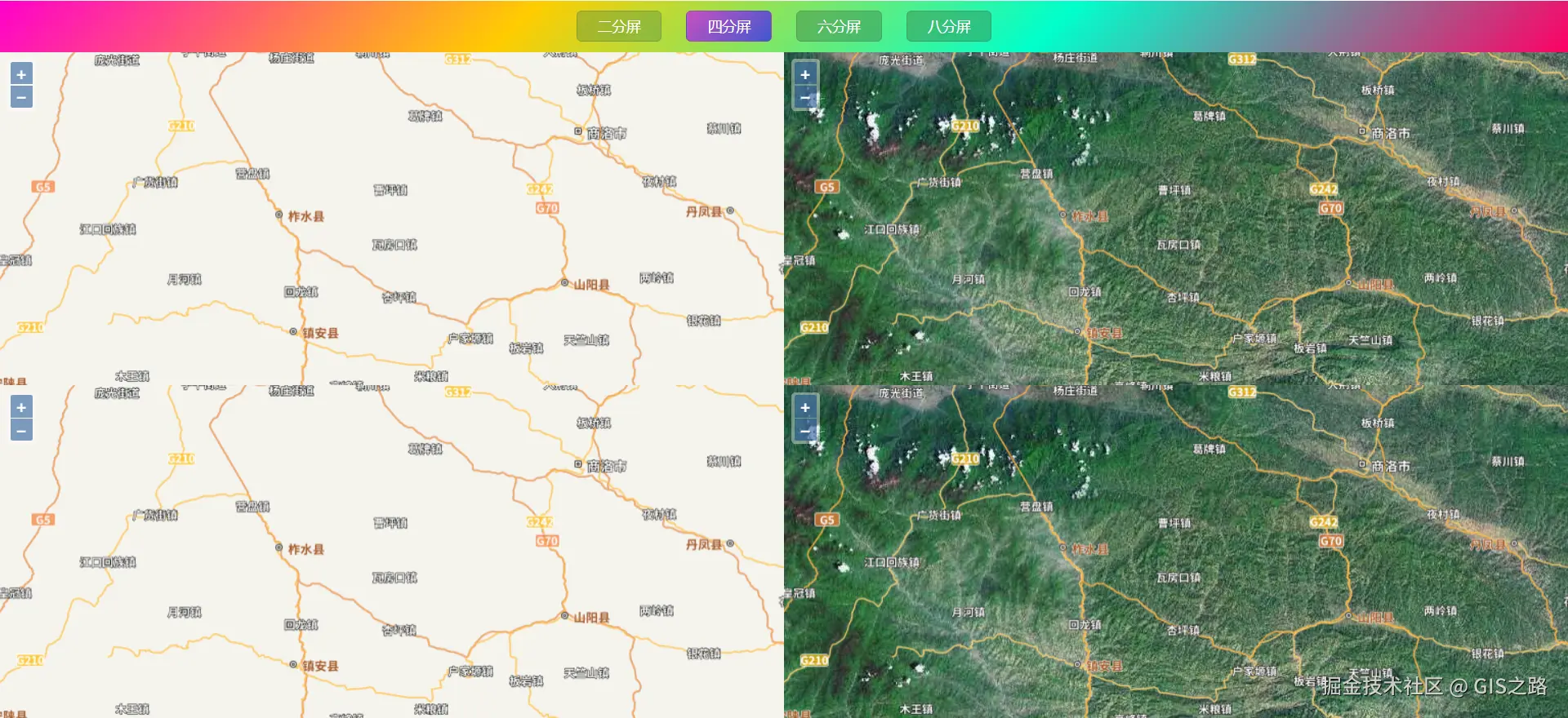 对于创建的地图,通过控制其中任意一个地图进行缩放或者拖动时,其它地图也进行同样的操作。常见的分屏模式有二分屏、四分屏、六分屏和八分屏。分屏对比实现请参考:**OpenLayers 分屏对比(地图联动)**地图二分屏:地图四分屏: